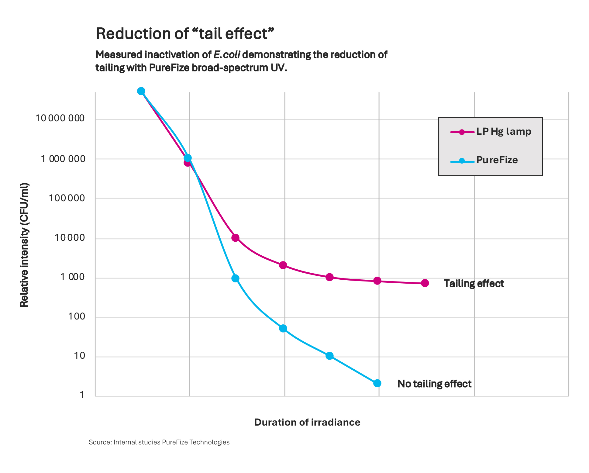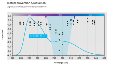 PureFizeシステムは、広帯域のUV照射により強力な殺菌効果が得られます。UV-Cは有害な微生物の細胞膜を破壊し、DNAまたはRNAに損傷を与えることで無害化します。これにより、病原体の増殖や正常な機能の阻害を防ぎ、効果的に不活性化します。UVBは微生物群に浸透し、バイオフィルム(例:下水管のぬめりやプラークなどの粘膜)を破壊し、タンパク質と脂質に損傷を与えます。UVAは活性酸素種(ROS)を生成し、重要な細胞構造に酸化ストレスを与えます。これらの相乗効果によりバイオフィルムを効果的に破壊し、高度な微生物抑制に大きな効果をもたらします。